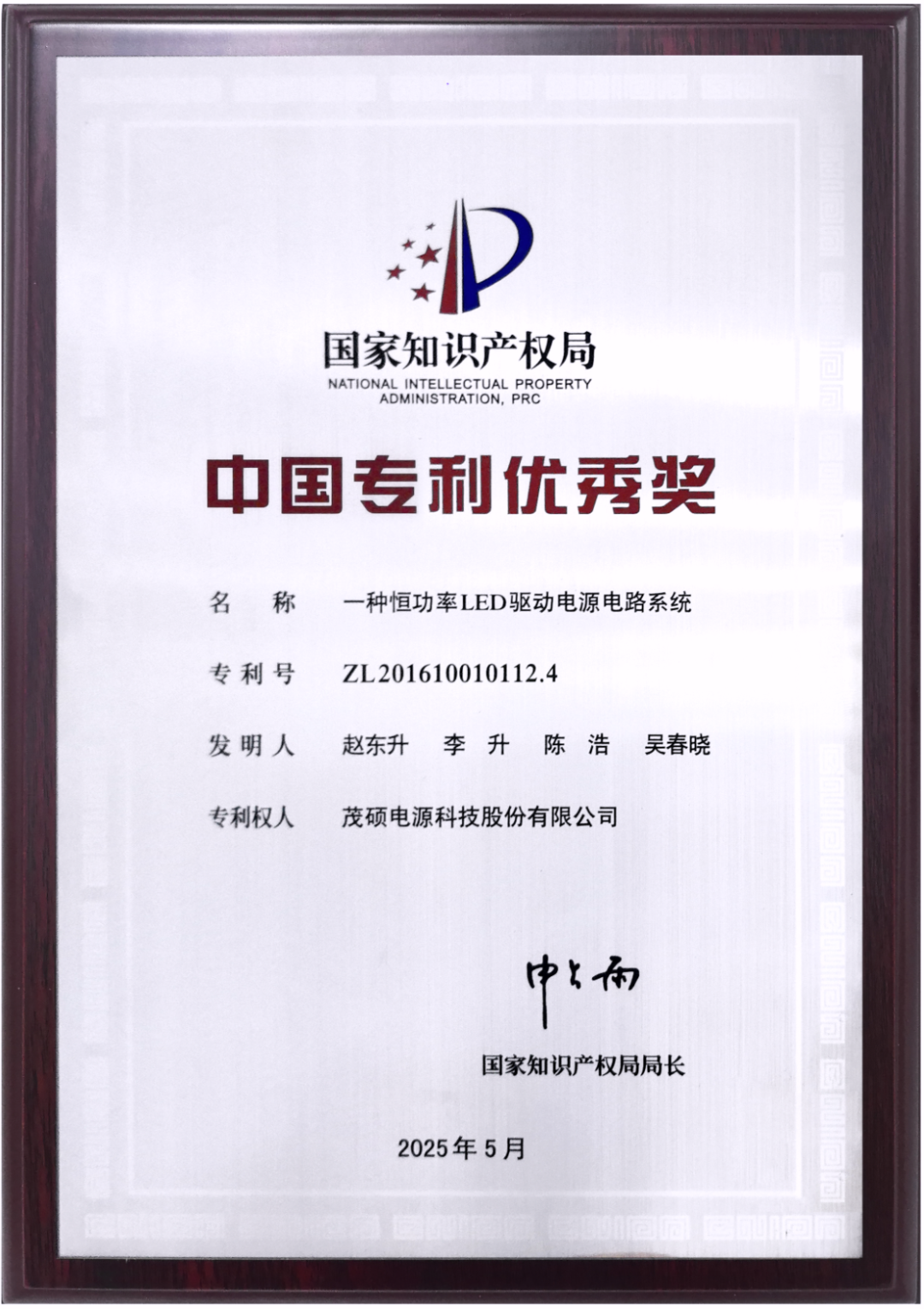 中国专利奖作为我国专利领域的最高政府奖项,由国家知识产权局与世界知识产权组织联合主办,是国内唯一专门对授权专利发明创造给予奖励的政府部门奖,获奖成果均代表着行业技术创新的顶尖水平。茂硕电源此次获奖,标志着公司在 LED 驱动电源领域的研发能力、成果转化效率及行业贡献度获得国家级认可。