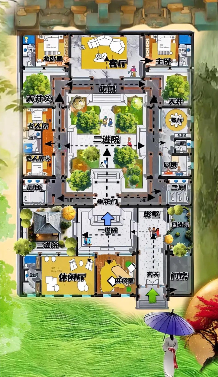 这个合院非常有意思,一进院属水,二进院属景,602㎡变成一个国风奢侈品,一亩地营造,意境灵动的大院子!